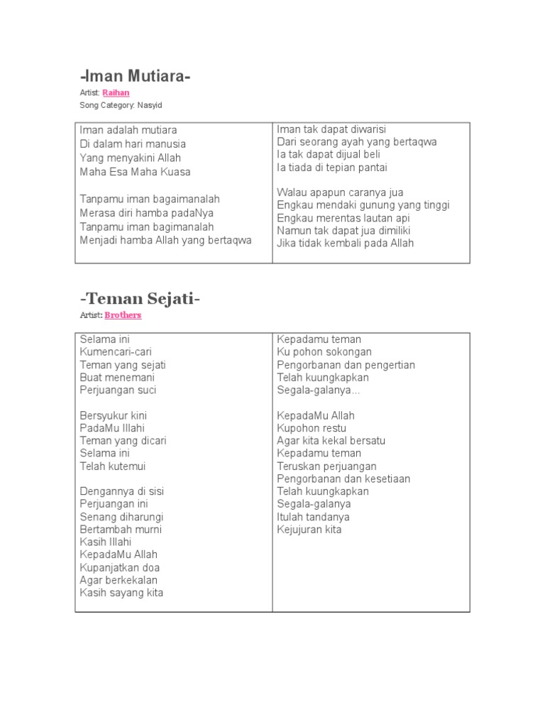Daftar Lirik Lagu Nasyid Terlengkap Lirik Video Nasyid Iman Mutiara Raihan